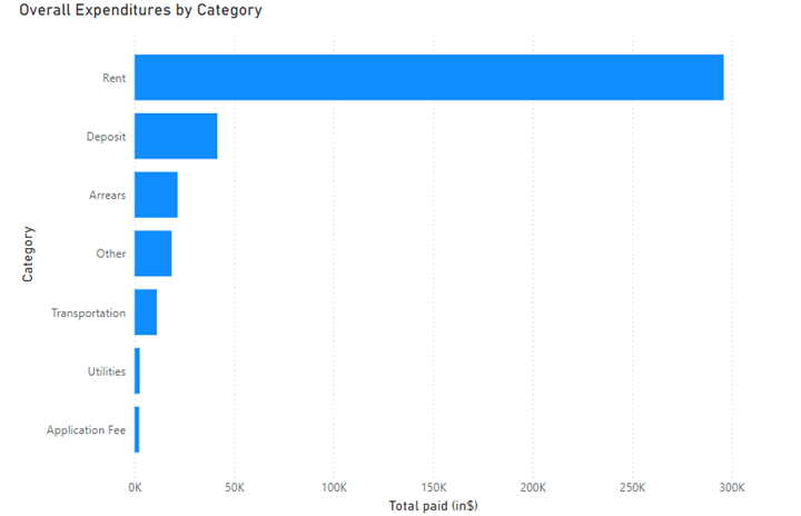 The chart in Figure 1 provides a clear view of how the Housing Solutions Fund prioritizes spending across major categories. Rent expenditures dominate the total allocation, exceeding $300,000. This substantial investment underscores the program’s focus on addressing the immediate housing crises of individuals and families, preventing evictions, and ensuring stable housing situations for those facing financial difficulties. Rent spending is often critical in stabilizing households on the verge of displacement, particularly as rent-related payments represent the most pressing and immediate needs for housing stability.