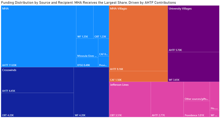 Figure 6 The Missoula Housing Authority (MHA) receives the largest share of funding, primarily supported by AHTF contributions. Other recipients, such as MHA-Villagio and University Villages, also benefit significantly, while smaller funders like OBT and WF target niche services for specialized needs.