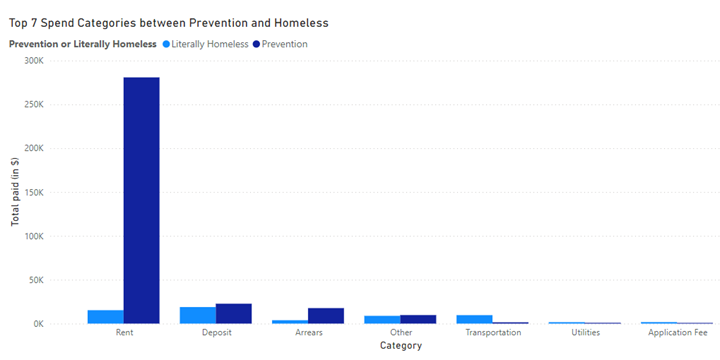Figure 2Top 7 Spend Categories Between Prevention and Homeless: Rent dominates spending, with prevention-focused funding significantly outpacing support for literally homeless individuals across all categories..