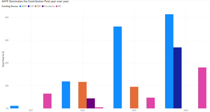 Figure 5 AHTF Leads Funding Contributions: The Affordable Housing Trust Fund (AHTF) consistently dominates funding, driving year-over-year growth in total contributions, while smaller sources like CAF, OBT, and WF provide critical supplementary support.