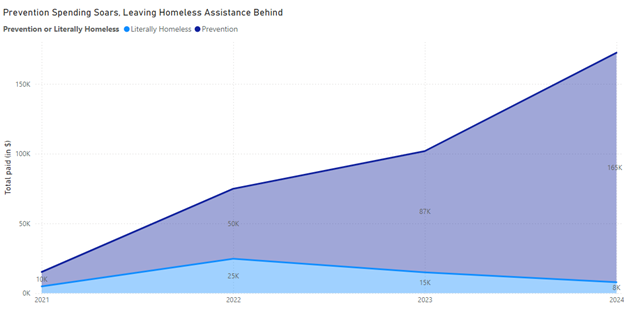 Figure 3 Prevention spending has significantly outpaced homeless assistance over time, with a sharp rise from 2021 to 2024, highlighting a growing focus on stabilizing housing and preventing homelessness.