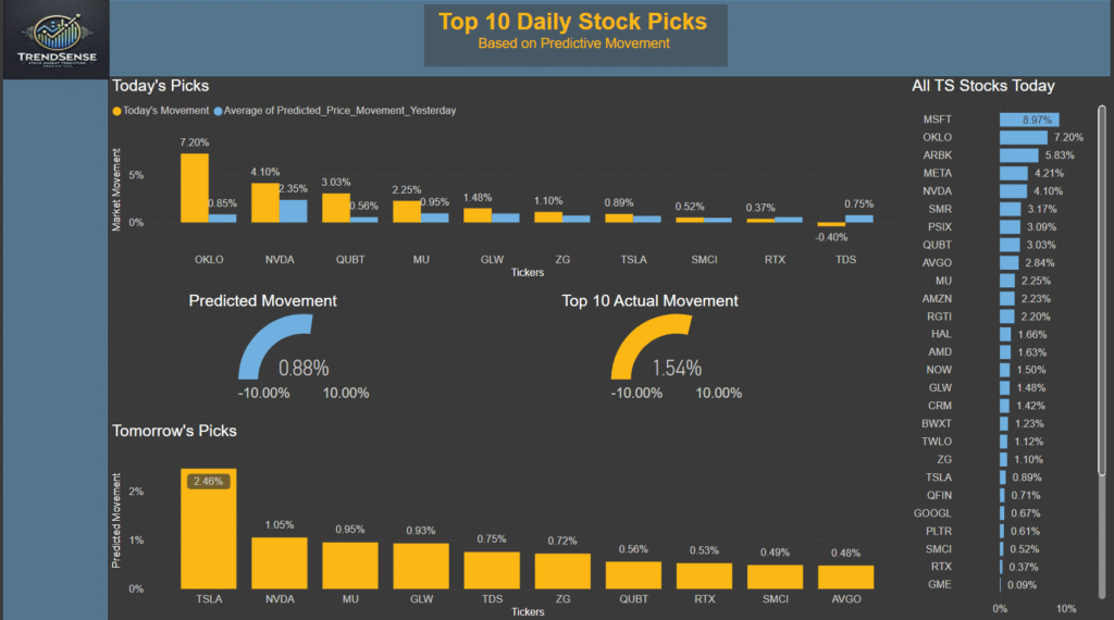 The Tomorrow’s Picks section ranks stocks expected to have the highest movement in the next trading day based on AI-driven sentiment analysis, financial health scores, and regression modeling. Investors can use this dashboard to track daily trends, refine their short-term trading strategies, and validate the predictive model’s performance.
