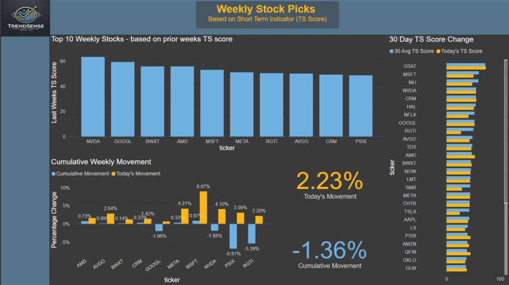 This page also includes ranking metrics like TS Rank, Composite Rank, and TS Score Change, which help identify the top 10 stocks daily and weekly. These layered metrics allow TrendSense to adapt in real time and help investors sort through dozens of tickers to find high-confidence picks.