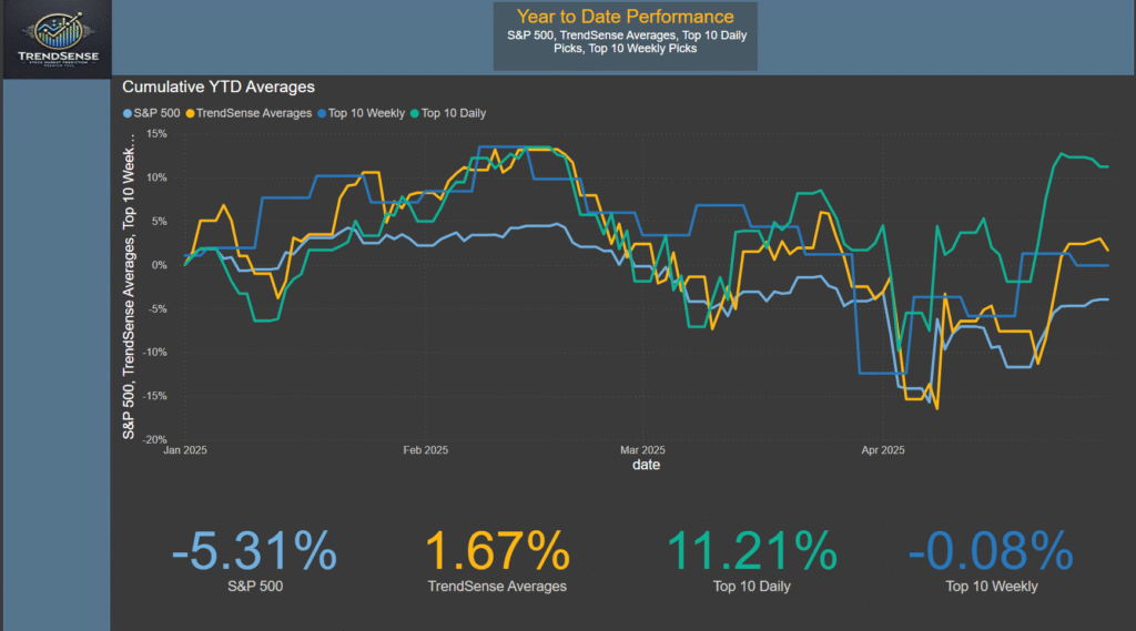 The YTD Performance Dashboard tracks how TrendSense’s stock picks compare to the overall market, specifically against the S&P 500 benchmark. The line chart shows how different stock groups—TrendSense’s tracked stocks, top daily picks, and top weekly picks—have performed cumulatively throughout the year.