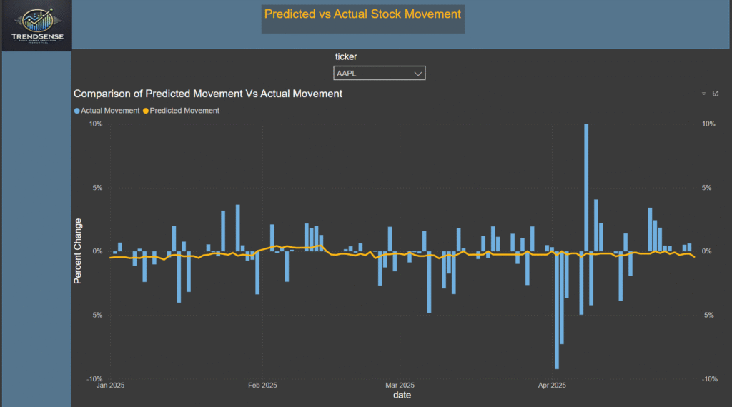 This dashboard tracks how the model’s daily forecasts stack up against actual market performance. The line graph shows Predicted vs. Actual Movement over time, helping assess the overall accuracy and consistency of the TrendSense system.