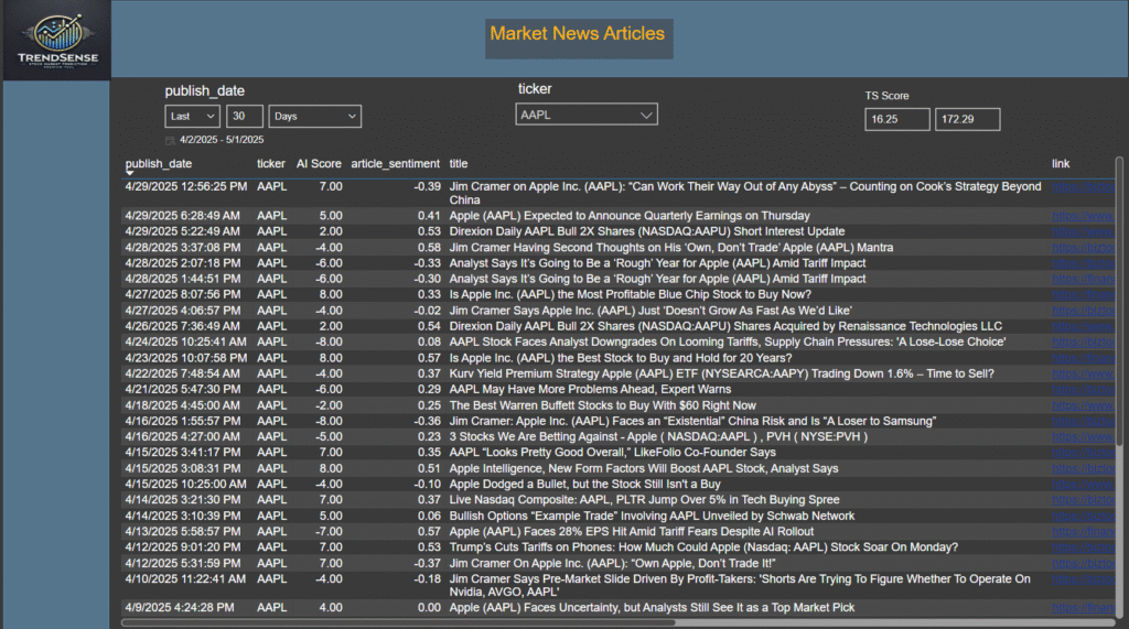 You can click the news links to read the original article and see how AI interpreted its tone. This dashboard demonstrates how TrendSense transforms qualitative market headlines into quantitative signals, bringing clarity to a noisy financial landscape.