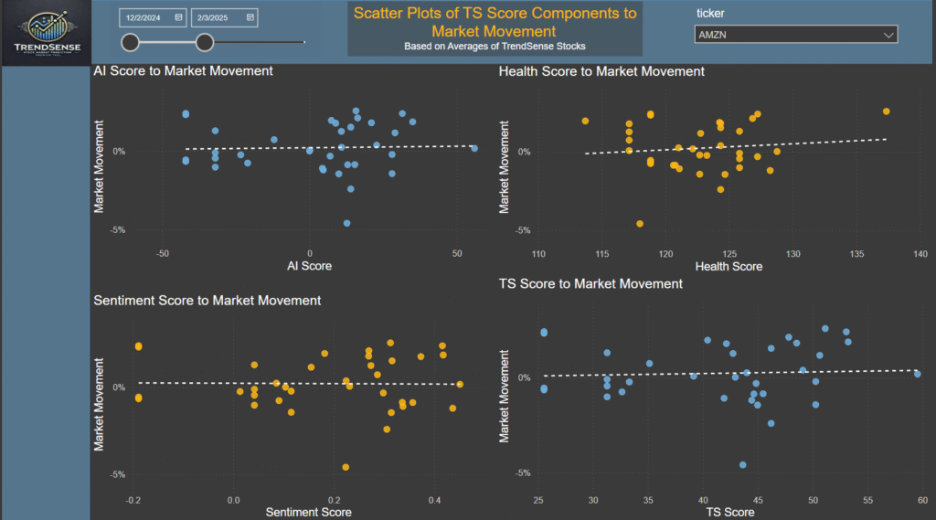 This dashboard visualizes the relationship between each core component of the TS Score—AI Sentiment, Market Sentiment, and Financial Health—and actual stock price movement. By displaying each component as a scatter plot, investors can assess which signals have the strongest correlation with short-term performance.