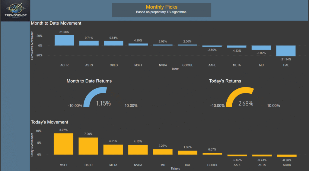 The Monthly Picks dashboard focuses on month-to-date (MTD) performance to identify stocks with consistent strength—or weakness—over a longer horizon. It’s designed to help investors look beyond daily volatility and recognize sustained movement trends that may signal long-term potential.
