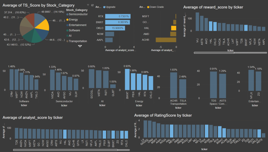 This system is fully automated and dynamic, with a Google Cloud-powered data pipeline that retrieves stock data in real-time, processes AI sentiment analysis using OpenAI’s language models, and updates predictions daily. The insights are presented in interactive Power BI dashboards, allowing users to explore daily, weekly, and year-to-date stock performance, sector-wide trends, and analyst ratings.